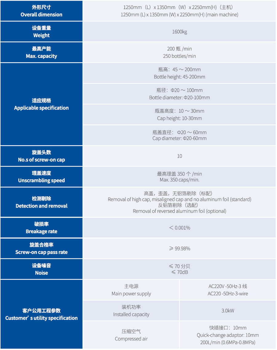 ◎ 反蓋、無鋁箔、旋蓋不良(松蓋、歪蓋)檢測(cè)剔除。透明鋼化玻璃防護(hù)門、低臺(tái)面設(shè)計(jì),優(yōu)質(zhì)不銹鋼和.鋁合金混搭,整潔亮麗,視野通透,方便清潔,機(jī)型高檔。