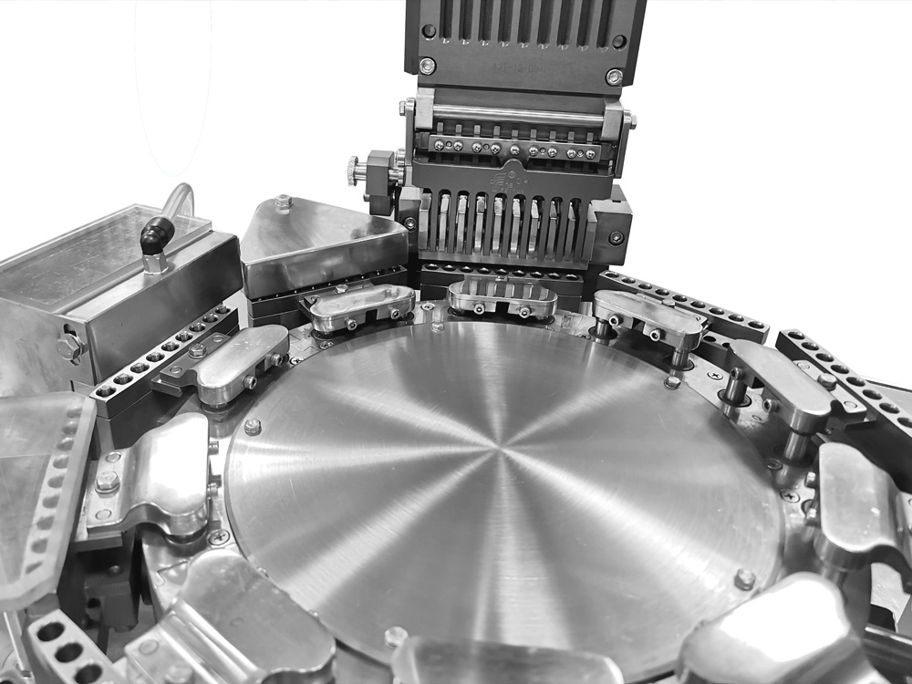 改進(jìn)刮粉器的結(jié)構(gòu):改變傳統(tǒng)平角刮粉器,使計(jì)量盤每工位的首尾的裝量和其它孔位一致,提高藥粉的裝量精度。